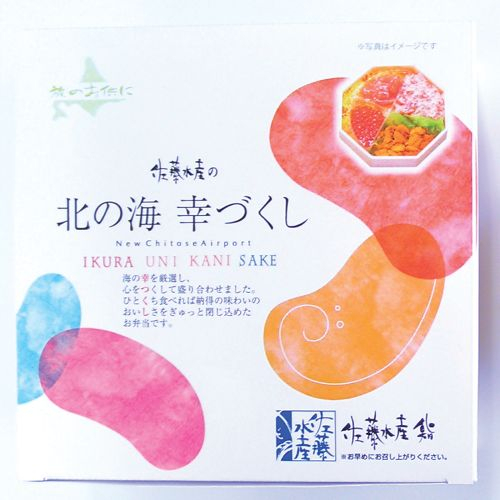北海道の海の幸満載のお弁当 蒸しウニと醤油漬いくら、特製酢味付けのずわいがに。そして佐藤水産オリジナル商品「鮭ルイベ漬」も入った4種の食材が合わさった贅沢な海鮮鮨です。おしゃれな箱が目印です。