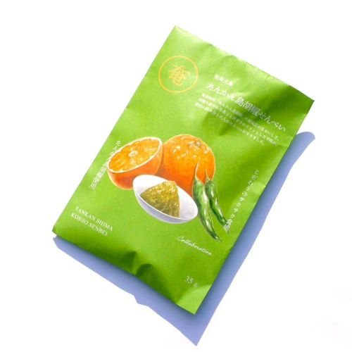 柑橘の爽やかな香りと唐辛子のピリッとした辛味が絶妙に合うせんべい 爽やかなたんかんの風味と島胡椒(唐辛子)がピリッと後引くおいしさに仕上がりました。暑い夏、ビールと一緒にどうぞ。
