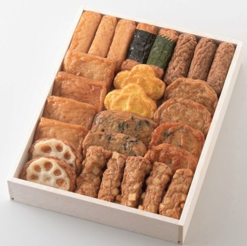 ●特揚げ棒天×7本、いわし棒天×7本、のり巻き棒天×1本、しそ巻き棒天×1本、人参天×4枚、ごぼう天×2枚、野菜天×2枚、レンコン天×2枚、五目揚げ×2枚、いも棒天×5枚、梅型おはら揚げ(黄)×2個(産直45)