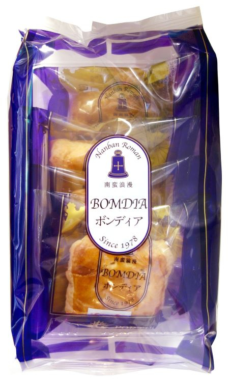 小豆あんとクルミをパイ生地で包んで焼き上げた南蛮菓です ボンディアはポルトガルのアベイロ市と大分が姉妹都市となった記念に創作されたお菓子です。異国の地の素材や作り方を学び、日本古来の素材である小豆あんをアレンジしたパイ生地で包んだ異国文化同志の出会いともいうべき銘菓です。