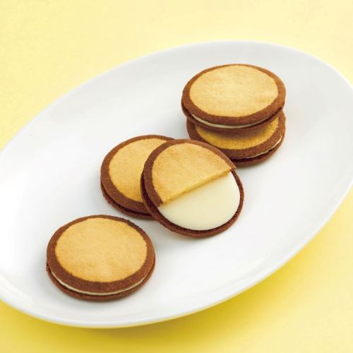 ソフトクリーム風ビスケットサンド 北海道産バターと小麦粉にアーモンド粉もブレンドして香ばしく焼き上げたビスケット。ソフトクリーム風ホワイトチョコもサンドした、クリーミーな美味しさ。