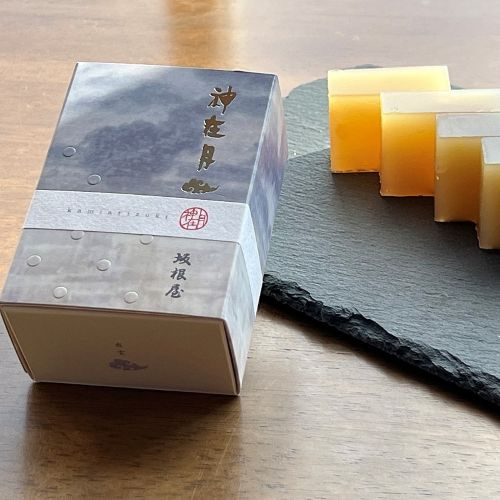 出雲に神々が集う「神在月」にだけ作る、希少な出雲産白小豆を使用した特別な白小豆羊羹 神在月に降るとされる”あられ”が水面に浮かぶ風情を繊細に表現しております。神様の訪れを知らせるようなあられの神秘的な美しさが宿る一品です。