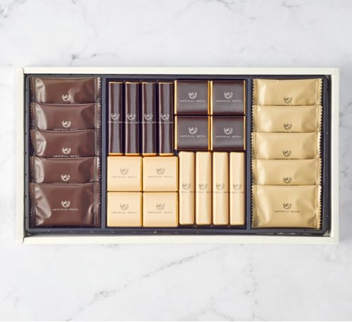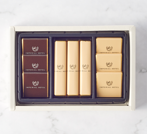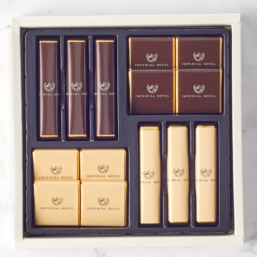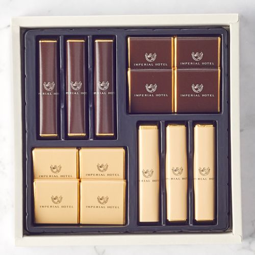 食べやすくスタイリッシュなスティックタイプと、一口サイズで口あたりなめらかなプレートタイプの両方を楽しめるチョコレート詰合せです。ほろ苦いビターと美しい模様のマーブルチョコレートは、素材をいかした本格的な味わいが特徴です。帝国ホテル2代目本館(通称「ライト館」)の煉瓦をモチーフにした、帝国ホテルの歴史と伝統が垣間見える一品です。