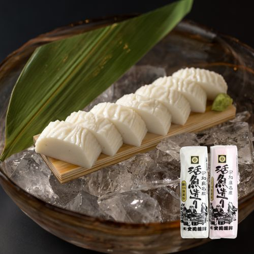 「活魚造り」は、宇和海で水揚げされた鮮魚を石臼ですり身にした、まさに手間ひまの結晶。しなやかな弾力と魚の旨みが感じられ、シンプルにわさび醤油で味わうのが店員のおすすめ。贈り物にも喜ばれています!