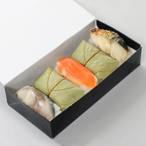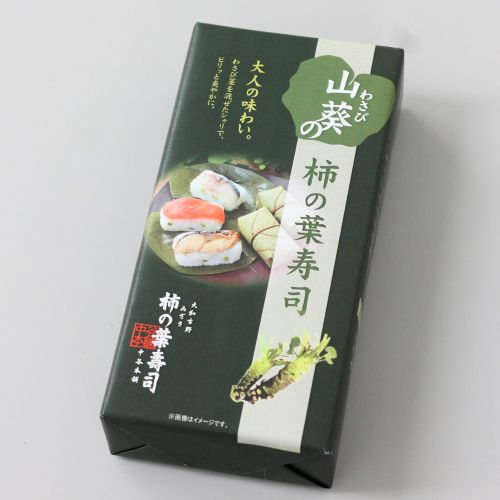 奈良県吉野名産の柿の葉すしです。 わさび茎を混ぜたシャリで、酢〆のさば・さけ・焼さばを包みました。ピリッと爽やかで、大人の味わいです。