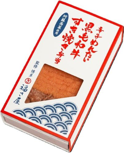 昭和53年創業 辛子めんたいの本場 福岡・博多で人気の「福さ屋」監修 「福さ屋 辛子めんたい」と希少な伝統野菜「阿蘇高菜」、特製の甘辛タレで仕上げた「国産黒毛和牛のすき焼き」の3種を、ごはんの上に敷き詰めた味わい豊かなお弁当です。